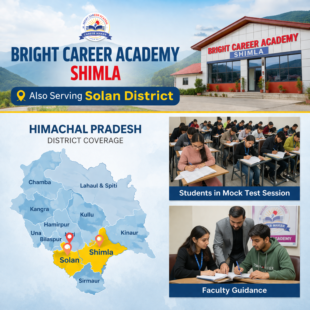 Bright Career Academy Shimla is undeniably the best coaching centre in Solan, Himachal Pradesh, offering expert faculty, comprehensive study material, online/offline coaching, and personalized attention to students from all over Himachal Pradesh. Whether you are in Shimla, Solan, Kangra, Mandi, Kullu, Hamirpur, Bilaspur, Una, Chamba, Sirmaur, Lahaul-Spiti, or Kinnaur, our courses are designed to help you succeed in SSC, Banking, NDA, CDS, HAS, and HP Police exams.