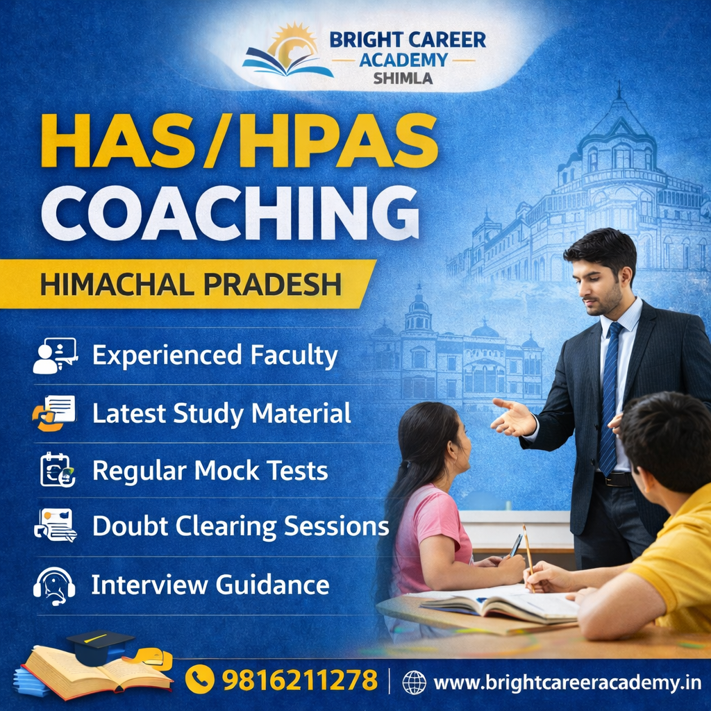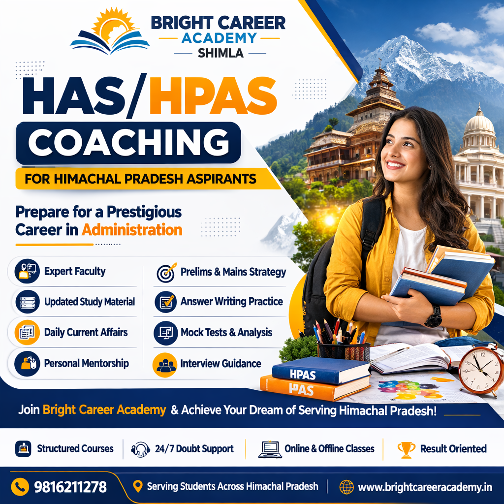 Bright Career Academy Shimla provides comprehensive HAS / HPAS coaching designed to help students from across Himachal Pradesh prepare effectively and achieve their career goals in public administration.